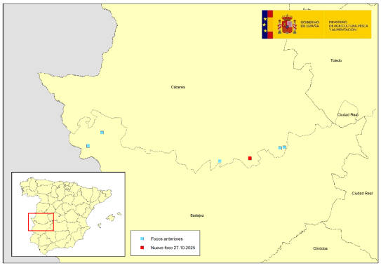 Desde la detección del primer foco de 2025, notificado el pasado 18 de septiembre en la localidad pacense de Alburquerque, se han registrado ya seis focos en la región: cuatro en la provincia de Cáceres y dos en la de Badajoz. Todos ellos se localizan en explotaciones de vacuno en régimen extensivo.