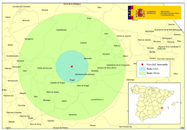 Las autoridades veterinarias de la Comunidad Valenciana notificaron el 29 de diciembre, un foco de enfermedad de Newcastle, en una explotación con un censo aproximado de 15.000 broilers localizada en el municipio Llutxent, comarca de Vall D´Albaida, en la provincia de Valencia. Este caso ha sido confirmado por el laboratorio de Algete.