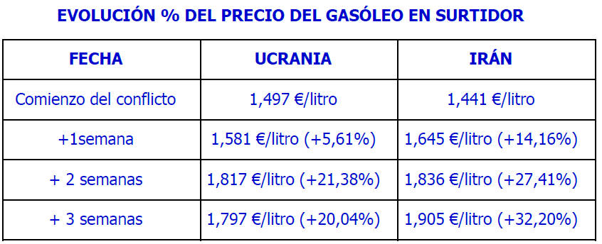 Los datos son concluyentes. Tras el inicio de la guerra de Ucrania, el precio del diésel siguió una escalada progresiva que llegó casi al 40 % al cabo de más de cuatro meses. En cambio, en la actual crisis, el incremento está siendo mucho más acelerado: en menos de tres semanas desde el inicio del conflicto en Irán, el precio ya acumula subidas por encima del 32%.